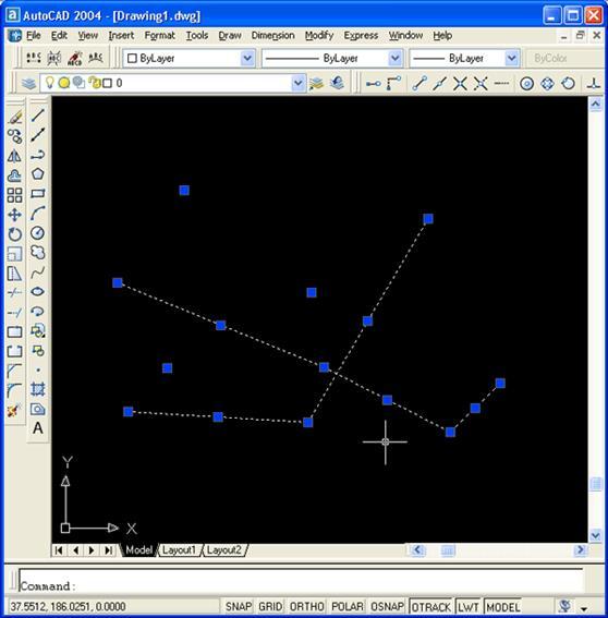 Необходимо с помощью левой кнопки мыши отметить ту форму точки, которую вы хотите получить. Рекомендуем выбрать форму в виде символа "х". В том же окне можно задать и размеры символа точки (поле Point Size (Размер точки)), которые могут быть либо в процентах от размера экрана, если включен переключатель Set Size Relative to Screen (Установка размера относительно экрана), либо в абсолютных единицах, если включен переключатель Set Size in Absolute Units (Установка размера в абсолютных единицах). Предпочтительнее сохранить те установки, которые показаны на рис. 2.23: 5% от размера экрана. Завершив установки, закройте окно. Система AutoCAD автоматически перерисует ранее заданные точки в новой форме. Представленные таким образом точки могут быть использованы для построений новых объектов с помощью функции объектной привязки Node (Узел). А сами точки, поэтому очень часто называются узловыми точками. Рассмотрим такую задачу: пусть необходимо построить отрезок, у которого концы являются ранее созданными узловыми точками. Для этого вызовем команду LINE (ОТРЕЗОК) и на запрос Specify first point: (Первая точка:) с помощью левой кнопки мыши выберем кнопку (Snap to Node (Привязать к узлу)) панели Object Snap (Объектная привязка). Затем устанавливаем указатель мыши на первую узловую точку (обнаружив ее, AutoCAD обводит точку кружочком). После этого опять обращаемся к функции объектной привязки Node (Узел) и указываем вторую узловую точку (рис.12).