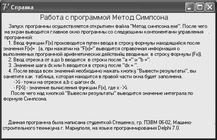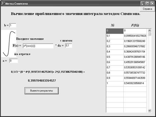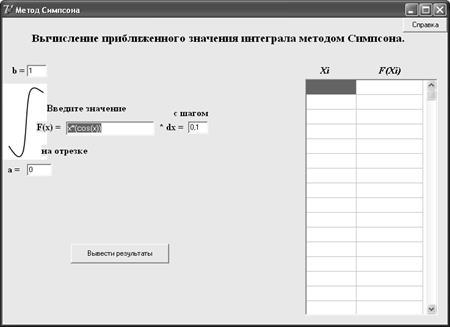 Целью курсовой работы является вычисление приближенного значения интеграла методом Симпсона, путем ввода функции, отрезка и шага dx. История появления и развития персональных компьютеров является одним из наиболее впечатляющих явлений нашего века. С момента появления первых образцов персональных компьютеров прошло меньше 25 лет, но сейчас без них уже немыслимо огромное количество областей человеческой деятельности - экономика, управление, наука, инженерное дело, издательское дело, образование, культура и т.д. Интерес к персональным компьютерам постоянно растет, а круг их пользователей непрерывно расширяется. В число пользователей ПЭВМ вовлекаются как новички в компьютерном деле, так и специалисты по другим классам ЭВМ. Благодаря новейшим технологиям в компьютерной сфере решение инженерных, математических, технических и коммерческих задач помогает быстро и точно решить ту или иную задачу. Актуальность решения задачи методом Симпсона с помощью ПЭВМ для учебных заведений – является быстрота и точность решения определенного интеграл от функции, имеющей неэлементарную первообразную.
