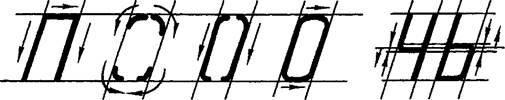 3. Серединный дополнительный элемент прописных букв чертежного шрифта Р, У, Ч, Я (где наиболее развита верхняя часть) проводим под средней линией вспомогательной сетки, в остальных случаях – над ней.