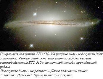 Например, в Млечном Пути первыми должны были образоваться звезды в центральном балдже, которые сейчас являются старейшими. Оставшийся газ сколлапсировал в плоскость, где медленно образовывались и вращались вместе с газом другие звезды. Этот тонкий плоский диск (хотя этот диск далеко не всегда плоский: см. рис. галактики ESO 510) стал местом большей части последующих активных событий в нашей Галактике: звезды, гигантские молекулярные облака, облака возбужденного газа и крупномасштабные спиральные узоры - все это развивалось здесь, в запутанной структуре, бросающей сейчас вызов нашим теоретическим моделям.