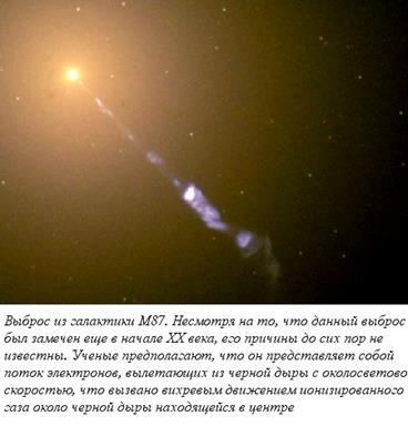 . Возмущение может исходить извне или же изнутри - из собственного ядра галактики. (см. рис. выброса из галактики M87) Одна из возможностей первого типа состоит в том, что межзвездный газ может втекать в галактику, образуя спиральные рукава. Эта гипотеза не очень привлекательна, так как газ будет преимущественно со стороны полюсов, где нет достаточного количества другого газа для столкновения, и известно очень мало случаев, когда спиральные рукава не лежат в плоскости диска. Более привлекательным внешним агентом может быть приливное воздействие других галактик при близких прохождениях. Приливы, порождаемые близкими прохождениями, почти столкновениями - воздействуют на звезды и газ и могут исказить форму галактики в достаточной степени для возникновения неправильных образований, которые в ходе вращения приобретут спиральную форму. Это красивая идея, но ее недостаток - в необходимости близкого прохождения другой галактики. К сожалению, расстояния между галактиками слишком велики, чтобы этот механизм мог быть эффективным в большинстве случаев. Однако в том, что касается прохождений галактик вблизи друг друга, нас могут ожидать сюрпризы. Недавние определения темпов звездообразования показывают. что в близко расположенных друг к другу галактиках темп звездообразования аномально велик - особенно в ядрах. Может быть, окажется, что приливные эффекты включаются гораздо легче, чем мы сейчас думаем.