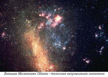 Большинство неправильных галактик очень похожи друг на друга. Они чрезвычайно фрагментарны и в них можно различить отдельные наиболее яркие звезды и области горячего излучающего газа.