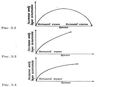 Сам Фридман рассматривал только одну модель, но можно указать три разные модели, для которых выполняются оба фундаментальных предположения Фридмана. В модели первого типа (открытой самим Фридманом) Вселенная расширяется достаточно медленно для того, чтобы в силу гравитационного притяжения между различными галактиками расширение Вселенной замедлялось и в конце концов прекращалось. После этого галактики начинают приближаться друг к другу, и Вселенная начинает сжиматься. На рис. 3.2 показано, как меняется со временем расстояние между двумя соседними галактиками. Оно возрастает от нуля до некоего максимума, а потом опять падает до нуля. В модели второго типа расширение Вселенной происходит так быстро, что гравитационное притяжение хоть и замедляет расширение, не может его остановить. На рис. 3.3 показано, как изменяется в этой модели расстояние между галактиками. Кривая выходит из нуля, а в конце концов галактики удаляются друг от друга с постоянной скоростыо. Есть, наконец, и модель третьего типа, в которой скорость расширения Вселенной только-только достаточна для того, чтобы избежать сжатия до нуля (коллапса). В этом случае расстояние между галактиками тоже сначала равно нулю (рис. 3.4), а потом все время возрастает. Правда, галактики "разбегаются" все с меньшей и меньшей скоростью, но она никогда не падает до нуля.