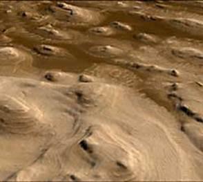 Облик этого полушария определила вулканическая деятельность. Некоторые из равнин сплошь покрыты древними изверженными породами. Потоками жидкой лавы растекались по поверхности, застывали, по ним текли новые потоки. Эти окаменевшие "реки" сосредоточены вокруг крупных вулканов. На окончаниях лавовых языков наблюдаются структуры, похожие на земные осадочные породы. Вероятно, когда раскаленные изверженные массы растапливали слои подземного льда, на поверхности Марса образовывались достаточно обширные водоемы, которые постепенно высыхали. Взаимодействие лавы и подземного льда привело также к появлению многочисленных борозд и трещин. На далеких от вулканов низменных областях северного полушария простираются песчаные дюны. Особенно много их у северной полярной шапки.