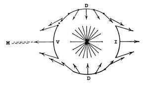 Частички,лежащие на экваторе и испытывающие при вращении центробежную силу, равную силе их притяжения к центру, теряли связь с остальной массой туманности и отслаивались от нее. Они продолжали вращаться уже самостоятельно, на определенном расстоянии от центра и с постоянной скоростью. Так как процесс охлаждения и сжатия туманности шел непрерывно, то от внутренних частей туманности, вращавшейся все быстрее и быстрее, в экваториальной плоскости частицы отрывались слой за слоем, всякий раз как центробежная сила для данных частиц уравновешивалась тяготением.