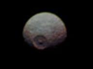необычен тем, что на нем обнаружили один огромный кратер, который имеет размер с треть спутника. Он покрыт трещинами, что, вероятно, вызвано приливным влиянием Сатурна: Мимас - ближайший к планете из крупных спутников. На фото можно увидеть тот самый огромный метеоритный кратер, названный Гершелем. Его размер - 130 километров. Гершель углублен в поверхность на 10 километров, с центральной горкой, почти такой же высокой, как и Эверест