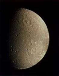 знаменита своей огромной трещиной-разломом, протяженностью 2000 км - три четверти длины экватора спутника! Фотографии Тефии, полученные от <Вояджера 2>, показали большой гладкий кратер с треть диаметра самого спутника, названный Одиссеем. Он больше, чем Гершель на Мимасе. К сожалению, на представленном снимке эти детали плохо различимы. О происхождении расщелины существуют несколько гипотез, в том числе и предполагающую такой период в истории Тефии, когда она была жидкой. При замерзании могла образоваться расщелина. Температура поверхности Тефии - 86 К.