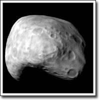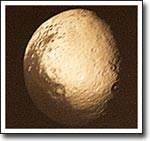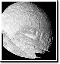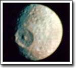 Мимас является одним из самых маленьких спутников Сатурна, однако на нем расположен один из самых больших кратеров, получившихся в результате столкновения. Если бы столкновение было немного более сильным, спутник был бы полностью разрушен. Этот кратер имеет название "Гершель" в честь Вилльяма Гершеля, открывшего Мимас в 1789 году. Гравитации Мимаса достаточно для образования единого почти сферического объекта, однако оне не может воспрепятствовать образованию на его поверхности очень крупных особенностей рельефа. Мимас состоит, в основном, из водяного льда с вкраплениями камней, т.е. представляет из себя большой грязный "снежок". Фотография, которую Вы видите, была получена аппаратом "Вояджер-1", пролетавшим в окрестностях Сатурна в 1980 году.