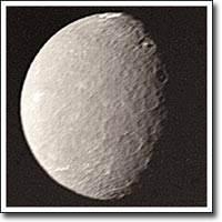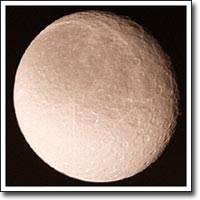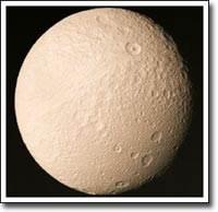 Тефия (Tethys) - один из самых больших и близких к планете спутников Сатурна. Его посещали оба космических аппарата Вояджер - Вояджер 1 в ноябре 1980 г. и Вояджер 2 в августе 1981 г. Сейчас известно, что Тефия почти полностью состоит из водяного льда. На Тефии есть огромный ударный кратер, занимающий почти целое полушарие. (Прим.: На снимке он не виден, т.к. всегда повернут к Сатурну.) То, что удар, в результате которого образовался этот кратер, не разрушил спутник, может служить свидетельством, что Тефия в прошлом не была полностью замерзшим телом. Джованни Кассини открыл Тефию в 1684 г.