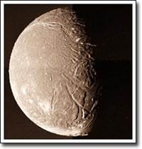 Как на поверхности Ариэля образовались ущелья? Этот вопрос возник после того, как Вояджер-2 пролетел мимо этого спутника Урана в январе 1986 года. Была развита теория, в которой из-за нагрева, вызванного приливным влиянием Урана, происходили "землетрясения" и значительные смещения частей поверхности спутника. Теперь на замерзшем Ариэле видна густая сеть желобов, многие из которых внутри покрыты неизвестным веществом. Ариэль - второй по расстоянию от Урана спутник после Миранды. Он состоит наполовину из водяного льда и наполовину из камня. Ариэль был открыт Вилльямом Ласселом в 1851 году.