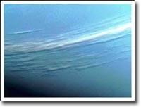 Встреча "Вояджера-2" с Нептуном, самой далекой газовой гигантской планетой, произошла в августе 1989 года. Во время этой встречи корабль подошел очень близко (около 40 тысяч км) к самому большому спутнику Нептуна Тритону. Поверхностная температура Тритона в среднем составляет -240 градусов Цельсия (33 градуса Кельвина). На поверхности спутника царит удивительный, сложный, активный мир. Например, темные пятна на фотографии являются маленькими вулканами, состоящими из азотного льда с примесью органических соединений, выброшенных во время действия гейзеров.