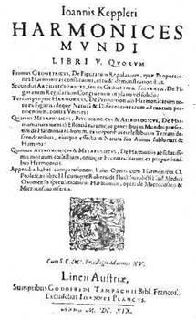 В 1599 г. Кеплер начинает работать над книгой, которую он задумал давно. Это научное произведение о мировой гармонии, он назовет “Harmonices Mundi Libri V” «Пять книг гармонии Мира» (или «Мировая гармония»). Эта работа была напечатана в1619 г. и включала пять отдельных книг, которые назывались: