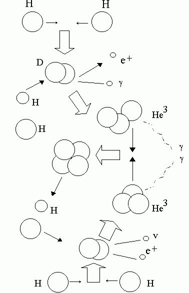 Протоны заряжены положительно, поэтому взаимно отталкиваются, причём, по закону Кулона, сила этого отталкивания обратно пропорциональна квадрату расстояния и при тесных сближениях должна стремительно возрастать. Однако при очень высоких температуре и давлении скорости теплового движения частиц столь велики, а частицам так тесно, что наиболее быстрые из них всё же сближаются друг с другом и оказываются в сфере влияния ядерных сил. В результате может произойти цепочка превращений, которая завершится возникновением нового ядра, состоящего из двух протонов и двух нейтронов, - ядра гелия.