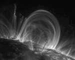 При наблюдении с поверхности Земли Солнечная корона, простирающаяся над видимой поверхностью Солнца - фотосферой - выглядит как с трудом различимое разреженное бледное образование, которое, однако, согласно измерениям в сотни раз горячее самой фотосферы. В чем источник ее нагрева? Астрономы с давних пор считали причиной высокой температуры короны магнитные поля, которые поднимают чудовищных размеров петли солнечной плазмы над фотосферой. Однако новые невероятно подробные наблюдения корональных петель, сделанные на спутнике TRACE, указывают на иной источник энергии неизвестной природы. Этот и другие снимки, сделенные на спутнике TRACE в диапазоне вакуумного ультрафиолета, свидетельствуют о том, что процесс нагрева происходит в нижней части короны вблизи основания петель там, где они соединяются с поверхностью Солнца. Новые результаты опровергают общепринятую теорию, предполагающей равномерный нагрев петель. На этом фантастическом изображении со спутника TRACE видны пучки величественных горячих корональных петель своими размерами в 30 и более раз превышающих диаметр Земли.