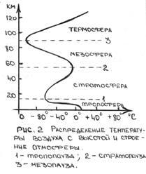 Особенно существенно свойства атмосферы меняются с высотой, Поэтому, основываясь на характере изменения тех или иных параметров атмосферы с высотой, ее делят на концентрические слои По составу атмосферу делят на гомосферу и гетеросферу .При рассмотрении электрических свойств атмосферы выделяют ионосферу - слой, в котором воздух сильно ионизирован. Наиболее распространено деление атмосферы по характеру изменения температуры с высотой. При этом выделяют тропосферу, стратосферу, мезосферу и термосферу (Рис.2.).