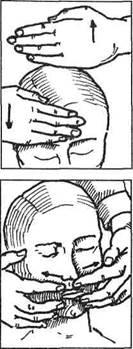 Поглаживание лба II—Vпальцами идет от середины лба к вискам. Массирование — вдоль скуловой дуги к вискам и от углов рта к вискам. Затем массируется подбородок; направление массажных движений — от подбородка вдоль нижней челюсти и вверх к ушам. Лоб массируется от переносицы до начала волося ного покрова одной или попеременно двумя руками. Средним и безымянным пальцами обеих рук проводится поглаживание у внутреннего угла глаза к брови. Затем глаза закрываются, и производится поглаживание глаз от внутреннего угла к виску; движения очень осторожные. Приемы растирания выполняются в области лба, подбородка, носа, щечных мышц, круговой мышцы рта. Разминание делается в области подбородка, щек, лба; вибрация — по точкам выхода тройничного и лицевого нервов подушечкой среднего пальца. Приемы растирания и разминания применяются также при повреждениях кожи и мышц лица, для ликвидации рубцов, выпотов, инфильтратов и пр., а вибрация — при различных заболеваниях нервов.