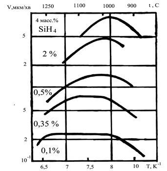 Рисунок 3 – Залежність швидкості росту плівок кремнію від температури осадження [4].