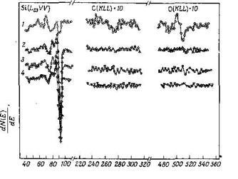 На рисунку 9 представлені оже-спектри для чотирьох етапів цього процесу. Перший спектр 1 отриманий від зразка кремнію, імплантованого іонами As +