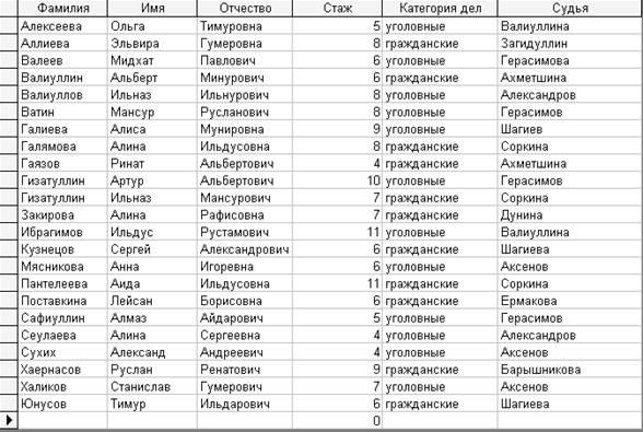 Следует отметить, что тип данных столбцов «Фамилия», «Имя», «Отчество», «Категория дел», «Судья» программа автоматически определила тип данных как «Текстовый», а «Стаж» - как числовой.