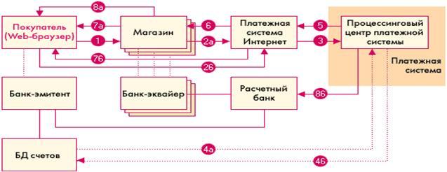 процессинговый центр передает в расчетный банк сведения о совершенной транзакции (8б). Деньги со счета покупателя в банке-эмитенте перечисляются через расчетный банк на счет магазина в банке-эквайере.