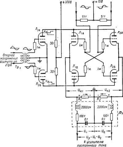Если ось антенны отклонена от цели по азимуту в противоположном направлении (вправо), то напряжение ошибки будет в противофазе с опорным напряжением азимута. Анодный ток и напряжение на катоде лампы Л1 этом случае возрастут, а анодный ток и напряжение на катоде лампы Л2