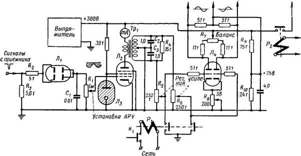 Применение резонансного контура позволяет получить на сетках триодов Л4 балансного усилителя синусоидальное напряжение без высокочастотных пульсаций, которые имеются в выходном напряжении детектора. Миллиамперметрm