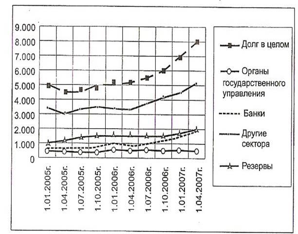 Внешний долг республики появился в 1992г. Первые кредиты были предоставлены Комиссией Европейского сообщества, США, Германией и Россией. Эти заемные средства были использованы для закупки зерна, сахара, подсолнечного масла, детского питания, медикаментов и медицинского оборудования, стабилизации платежного баланса и покрытия бюджетного дефицита. Такая направленность использования внешних заемных средств на социально-значимые и невалютоокупаемые проекты сохранилась до настоящего времени, предопределив проблемы с погашением и обслуживанием значительной части долга.