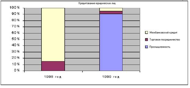 - в 1998 году кредитные вложения направлялись главным образом на межбанковское кредитование (85 %), на торгово-посредническую деятельность 15 %;
