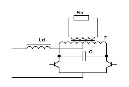 Кривая выходного напряжения Uн = Uc формируется путем периодического перезаряда конденсатора С в цепи с источником питания Е и дросселем Ld при поочередном отпирании тиристоров. С помощью напряжения на конденсаторе осуществляется запирание одного тиристора при отпирании другого.