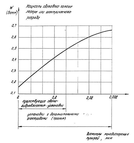 Рис. 2.3. зависимость диаметра монодисперсных парожидкостных микропузырей очищающей жидкости от мощности светового потока лазера.