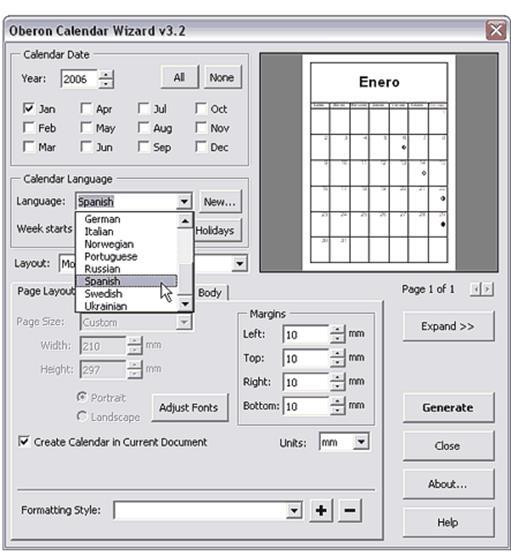 2. В открывшемся окне Oberon Calendar Winzard можно задать нужные вам установки, мы остановимся только на выборе языка.