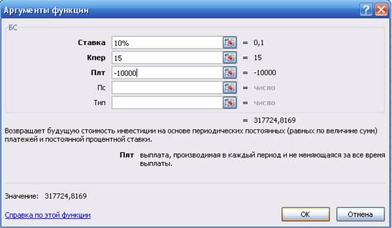 БС – возвращает будущую стоимость инвестиций на основе периодических постоянных (равных по величине сумм) платежей и постоянной процентной ставки.