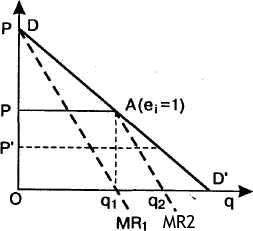 Предположим, что первым начинает производство дуополист 1, который в первое время оказывается монополистом. Его выпуск (рис. 34.1) составляет q1, что при цене Р позволяет ему извлекать максимальную прибыль, ибо в этом случае MR = = МС = 0. При данном объеме выпуска эластичность рыночного спроса равна единице, а общая выручка достигнет максимума. Затем производство начинает дуополист 2. В его представлении объем выпуска сдвинется вправо на величину Oq1 и совместится с линией Aq1. Сегмент AD' кривой рыночного спроса DD он воспринимает как кривую остаточного спроса, которой соответствует кривая его предельной выручки MR2. Выпуск дуополиста 2 будет равен половине неудовлетворенного дуополистом 1 спроса, т. е. сегмента q1D', а величина его выпуска равна q1q2, что даст возможность получить максимум прибыли. Данный выпуск составит четверть всего рыночного объема спроса при нулевой цене, OD'(1/2 x 1/2 = 1/4).
