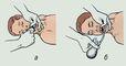 Оживление по программе АВС осуществляется в три приема, выполняемых строго последовательно. В первую очередь обеспечивают восстановление проходимости дыхательных путей (А). Для этого больного или пострадавшего укладывают на спину, голову максимально запрокидывают назад, а нижнюю челюсть выдвигают вперед, чтобы зубы этой челюсти располагались впереди верхних зубов. После этого пальцем (лучше его обмотать носовым платком) круговым движением обследуют полость рта и освобождают ее от инородных предметов (песок, куски пищи, зубные протезы и т.п.), рвотных масс и слизи (рис. 2