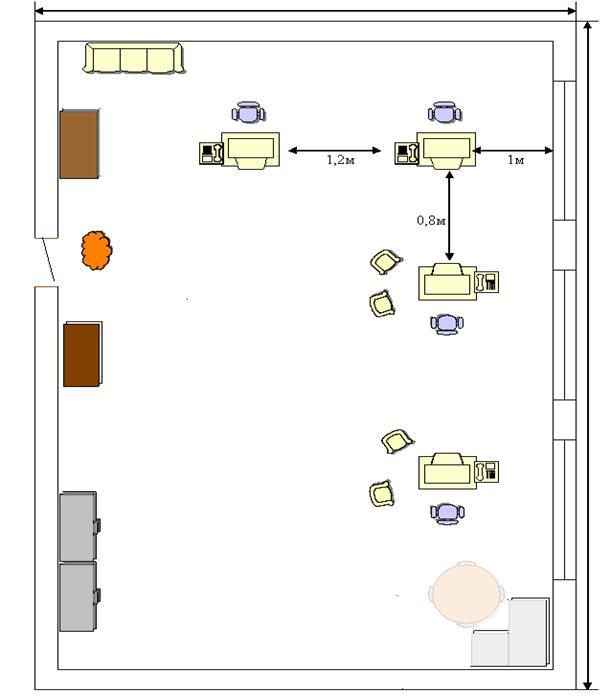 1. Расстояние между рабочими местами с боковых сторон должна быть не менее 1,2м, при расположении пользователей последовательно не менее 2-х метров, лицом друг к другу – 0,6м.