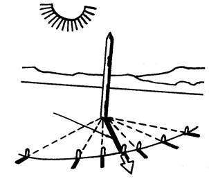 На открытой местности определяют азимуты (угол в градусах, измеренный по ходу часовой стрелки от северного конца меридиана до направления на ориентир), точек восхода и заката солнца. Полусумма азимутов укажет направление истинного меридиана. Если полусумма меньше 180, то склонение восточное, если больше – западное.