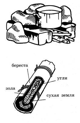 деревьев, хвою, сырой мох. В зимнее время костер следует укрывать от снега лапником.