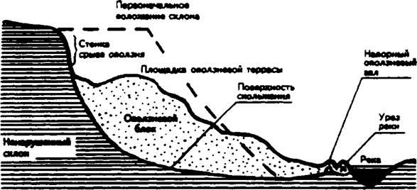 Оползни — это смещение масс горных пород вниз по склону под действием силы тяжести. Они образуются в различных породах в результате нарушения их равновесия и ослабления их прочности и вызываются как естественными, так и искусственными причинами. К естественным причинам относятся увеличение крутизны склонов, подмыв их оснований морскими и речными водами, сейсмические толчки и т.п. Искусственными, или антропогенными, т.е. вызванными деятельностью человека, причинами оползней являются разрушение склонов дорожными выемками, чрезмерный вынос грунта, вырубка леса и т.п. Согласно международной статистике до 80% современных оползней связано с деятельностью человека. См. Продольный разрез оползня.