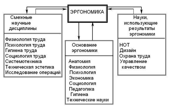 Кроме того, следует выделить междисциплинарные связи эргономики с группами общественных, естественных и технических наук. Взаимосвязь с общественными дисциплинами проявляется в том, что в основе теоретических положений эргономики лежит представление о труде как особой фундаментальной сфере человеческой деятельности, понимание того, что она не сводится к совокупности чисто механических операций, а представляет собой форму реализации и развития способностей индивида как личности. С естественнонаучными дисциплинами эргономика связана учетом физиологических, биофизических, биомеханических, психологических закономерностей трудовой деятельности. Взаимосвязь эргономики с техническими науками обусловлена тем, что она возникла на базе современной техники и тех разнообразных требований, которые технические средства предъявляют к взаимодействующему с ними человеку.