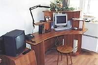 Встречается и обратная ситуация, тоже, кстати, довольно распространенная. Для работы имеется большой стол, иногда даже Г-образный, с выдвижной доской для клавиатуры, что сейчас модно, и всяческими другими приспособлениями.