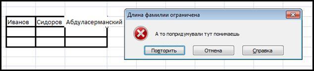 5.4. Например, для задания конкретной длины для поля имени и фамилии (C1) равной текущей длине поля имени (A1) и поля фамилии (B1) выберите значение ограничения Меньше или равно в поле Данные и введите =СУММ(ДЛСТР(A1);ДЛСТР(B1);10) в поле Максимальное значение.