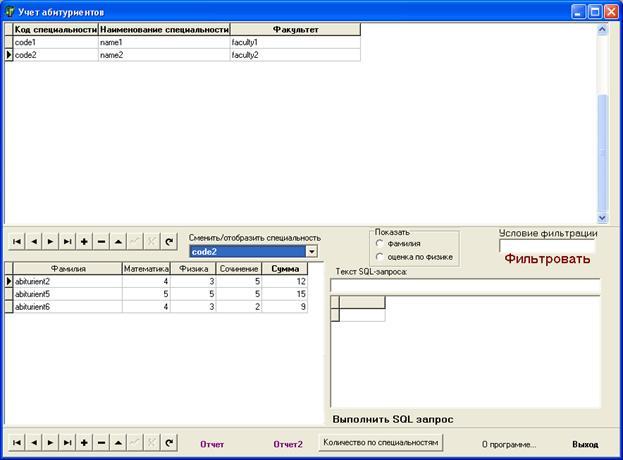 Второе событие - onCloseUp – происходит, когда пользователь выбрал нужную специальность из списка и список закрывается. В обработчике этого события восстанавливается связь между главной и подчиненной таблицами. И снова можно перемещаться по строкам таблицы специальностей и смотреть абитуриентов по каждой из них (см. рис. 5).