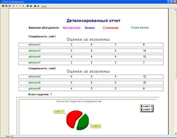 Рисунок Г.1 – Количество абитуриентов по специальностям – отчет и диаграмма