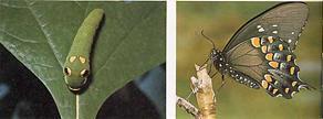 И никто бы не подумал, что зеленая гусеница с комически свирепым «лицом» (справа) превратится в парусника троила, одну из самых