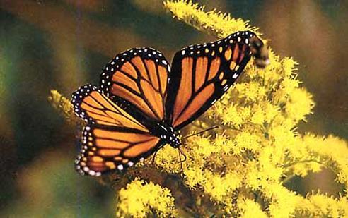 ют одними и теми же маршрутами, останавливаясь чтобы подкрепиться нектаром диких цветов. Особенной популярностью у них пользуется золотарник (внизу). Оказавшись на зимних квартирах, бабочки собираются плотными массами на деревьях (на следующей странице), хотя прилетают они обычно группами не более десяти штук. Весной данаиды вновь улетают на север. По пути самки откладывают оплодотворенные яйца на молочай. Ко времени окончания путешествия туда и обратно практически все из первоначальных мигрантов умирают.