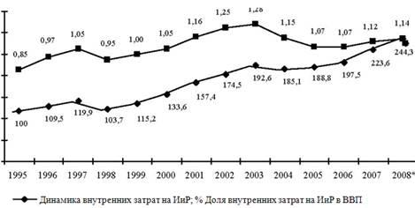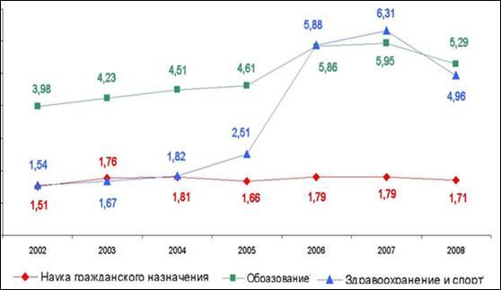 В последнее десятилетие показатель доли бюджетных средств во внутренних затратах на исследования и разработки составлял около 60%, который незначительно отличался от его среднего значения. Это отличает Россию от развитых стран мира, где финансирование науки из государственного бюджета составляло в 2002-2007 годах от 20% до 50% суммарных расходов на эти цели. Как видно, финансирование науки гражданского назначения как часть бюджетных расходов росло, но в меньшей степени, чем расходы на образование и здравоохранение (рис. 1).
