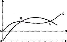 На графике представлена одна точка безубыточности В и приемлемый диапазон объемов производства. При этом линия АК показывает постоянные затраты, АD– совокупные издержки, отрезок КD характеризует величину переменных за трат, ОС – выручку от реализации продукции. Бухгалтерская модель показывает изменение совокупных издержек и доходов при уровне производства, который запланирован на будущее.