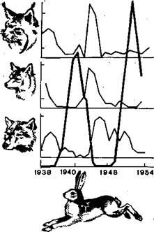 Рассмотрим в общей форме, как протекает этот процесс в биогеоценозах, где он только и может осуществляться (вспомним I) биогеоценозе как арене эволюционного процесса). В исторически cложившихся стабильных биогеоценозах численность составляющих их популяций, как правило, поддерживается на некотором среднем уровне. Регулятором стабильности выступает борьба за существование в виде ограничения беспредельной размножаемости популяций В качестве иллюстрации приведем данные колебаний численности зайца-беляка, с которыми связаны колебания численности хищников (рис. 19). Когда численность зайца достигает значительной величины, популяции хищников благо даря обилию пищи также увеличиваются. При сокращении численности зайцев из-за болезней, уничтожения и неблагоприятных климатических условий погибает и часть популяций хищников Численность популяции регулируется не только хищниками, патогенными микробами или абиотическими условиями, но и внутри-популяционными механизмами. Французский ученый Бреретон провел на мышах эксперимент, чтобы выяснить, каким образом скученность животных в клетке влияет на плодовитость самок. Результаты опытов показали, что при плотности, превышающей оптимальную, самки резко сокращали или вообще утрачивали способность давать потомство. Это явление получили название «эффект группы». Затем Л. Бреретон обратился к исследованиям эффекта группы на мучном жуке-хрущаке им рода Tribolium. И здесь оказалось, что в сосудах с большой плотностью самок процент оплодотворенных яиц был меньше, чем в сосудах с малой плотностью. Эти данные подкрепили выводы, что у организмов разных видов регуляция численности осуществляется не только внешними, но и внутренними механизмами Таким образом, как бы организмы ни стремились к размножению, совокупность разных факторов определяет в итоге реальную размножаемость — количество потомства в каждом поколении. Мерилом интенсивности борьбы за существование является плодовитость, измеряемая числом семян у растений, яиц и детенышей у животных, продуцируемых за сезон размножения.