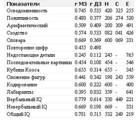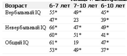 Таблица 4. Межвозрастные связи между суммарными показателями интеллекта (фенотипические корреляции)