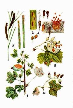 1 - пораженные листья и ягоды крыжовника; 2 - пораженные листья осоки; 3 - пустулы на листе осоки; 4 - различные стадии развития ржавчины; 5 - пораженные листья и ягоды красной смородины; 6 - - пораженные листья и ягоды черной смородины